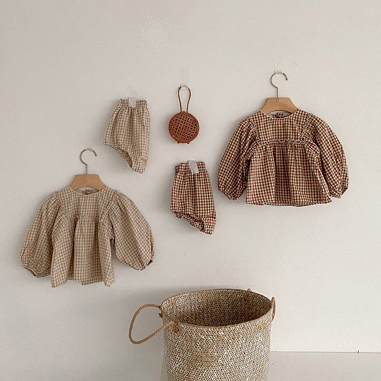 Girl's Suit Western Style Plaid Puff Sleeve Doll Top With Fart Pants Suit